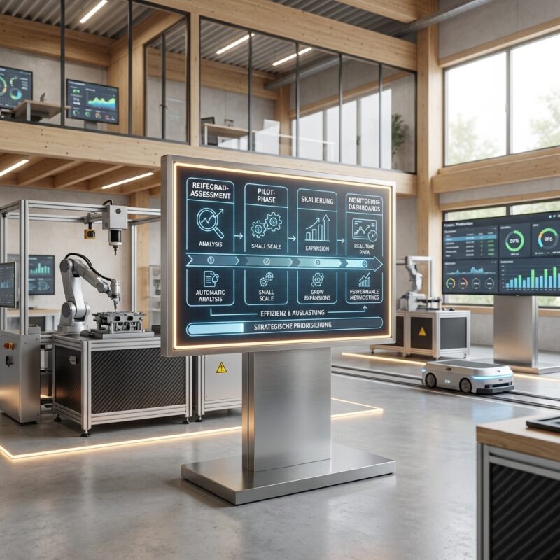 Welche Kategorien umfasst ein Reifegrad-Assessment?Typischerweise Organisation, Technologie, Produktion sowie Produkt und Geschäftsmodell mit über 50 Dimensionen (Dürr Consulting, o.J.).Wie priorisiert man Maßnahmen in der Roadmap?Durch Gap-Analyse zwischen Ist- und Zielzustand, fokussiert auf den höchsten Hebel in Pilotphasen (Unternehmensfokus, o.J.).